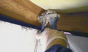 木部表面に薬剤をムラなく吹き付け、木材の接合部や隙間には薬剤を浸透させるように念入りに吹き付け処理を行ないます。