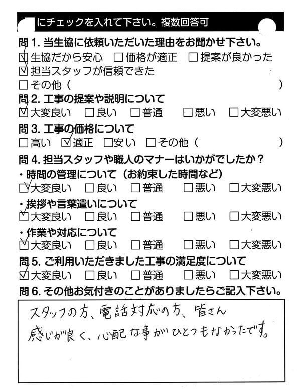 スタッフの方、電話対応の方、皆さん感じが良く、心配な事がひとつもなかったです。