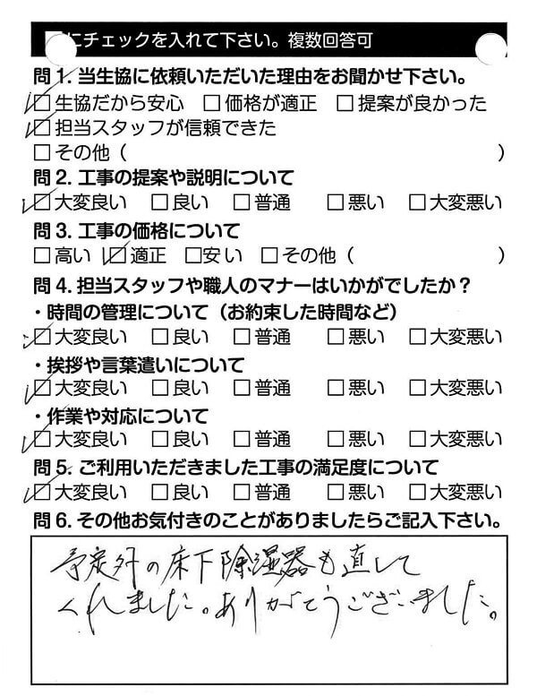 シロアリ発生で大変不安になっておりましたが、担当者の説明、作業、今後の事などを見聞きして、大変安心致しました。