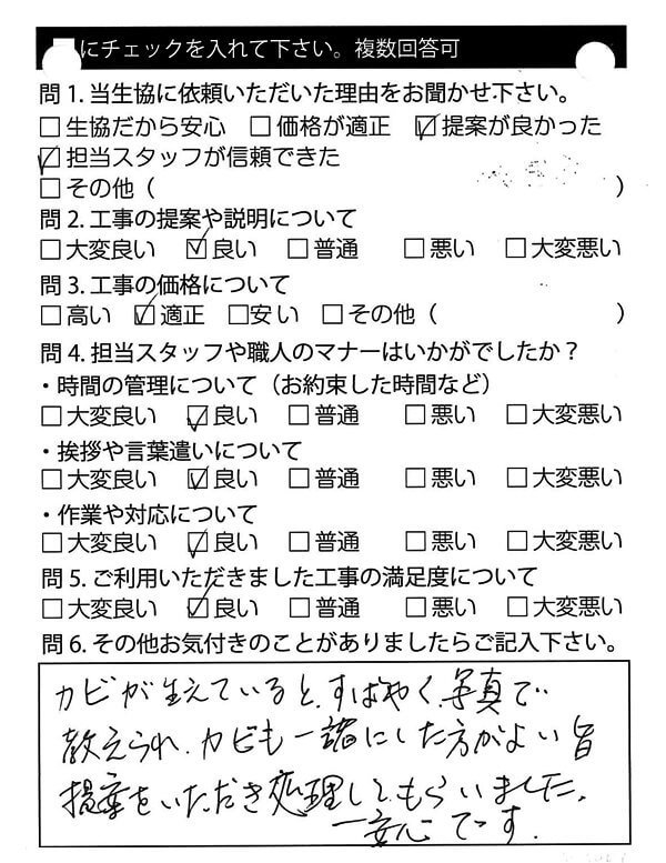 カビが生えていると、すばやく写真で教えられ、カビも一緒にした方が良い旨、提案をいただき処理してもらいました。