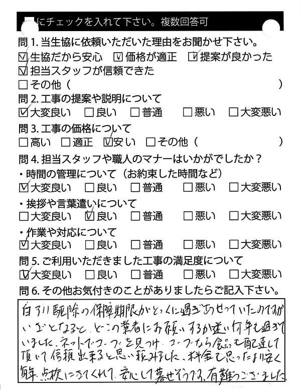 料金も思ったより安く毎年、点検にきてくれて安心して暮らせそうです。