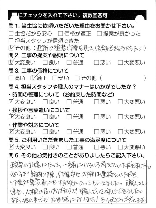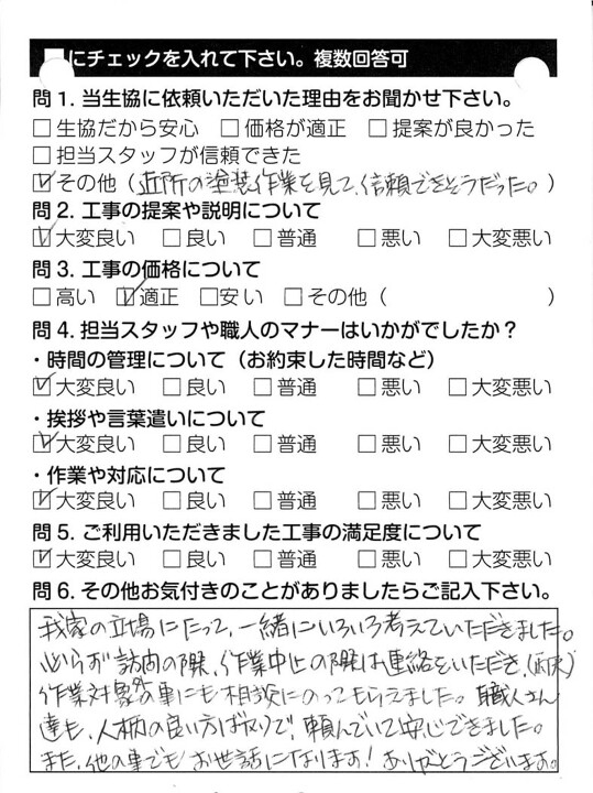我が家の立場にたって、一緒にいろいろ考えて頂きました。必ず訪問の際、作業中止の際は変更を頂き(雨天)作業対象外の事にも相談にのってもらえました。職人さん達も人側の良い方ばかりで、頼んでいて安心できました。また、他の事でもお世話になります!ありがとうございます。