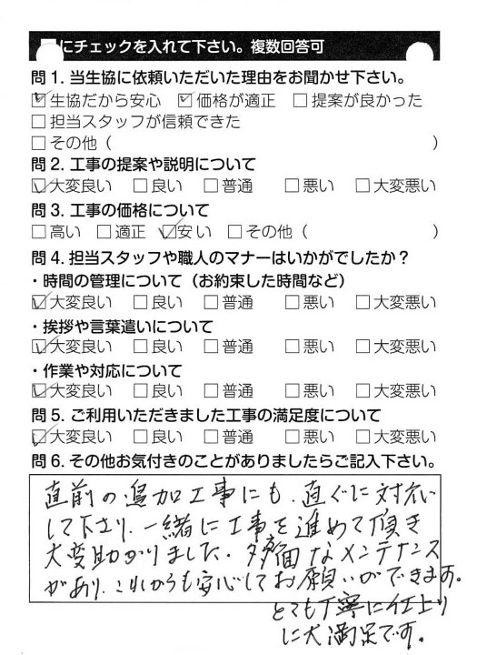 多方面なメンテナンスがあり、これからも安心してお願いができます。