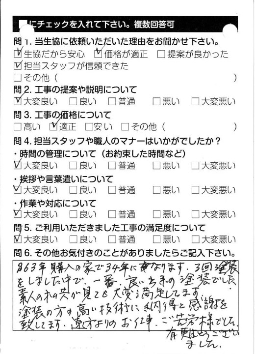 担当の方の説明は、大変わかりやすく、専門知識に裏付けられたもので安心すると同時に、信頼のできそうな人柄を感じさせるものでした。 着工にあたっては、間際で時期、場所等の変更があったにもかかわらず、快く対応してもらい感謝しています。費用の面でも、この家を新築したときにかかった費用から考えても、割安だったと思います。実際の工事も一つ一つの作業が丁寧で、家の出入りのとき、仕事の始まり、終わりのときなどいつも笑顔の応対で、面倒な事を頼んだときでも嫌な顔ひとつせずやってくれました。